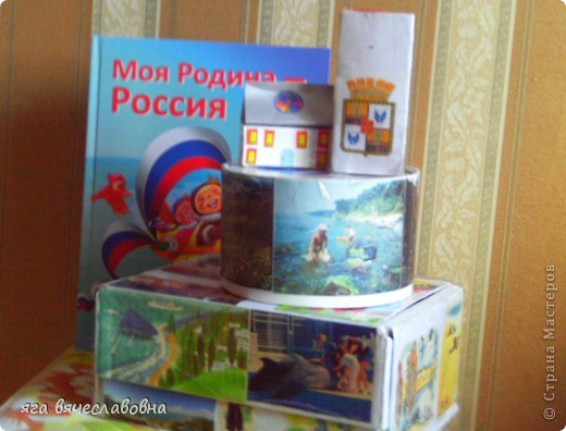 Это крышка нижней коробки.На ней столица-Москва,религия-православие,партия власти-Единая Россия,символы России-поле и береза.